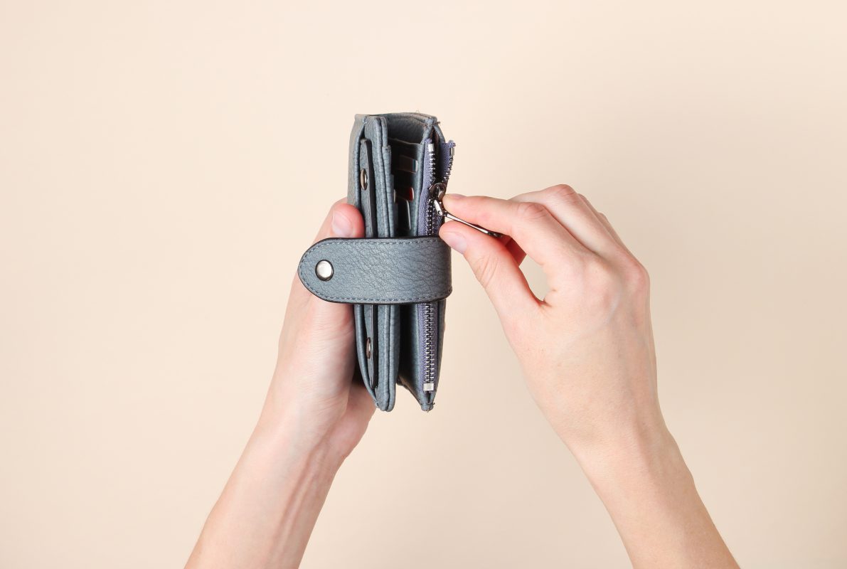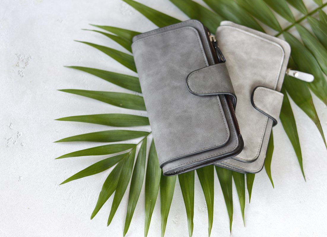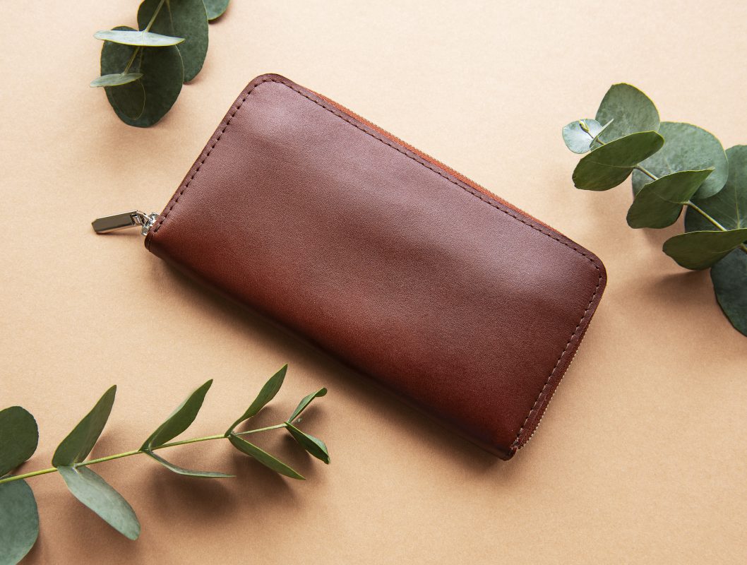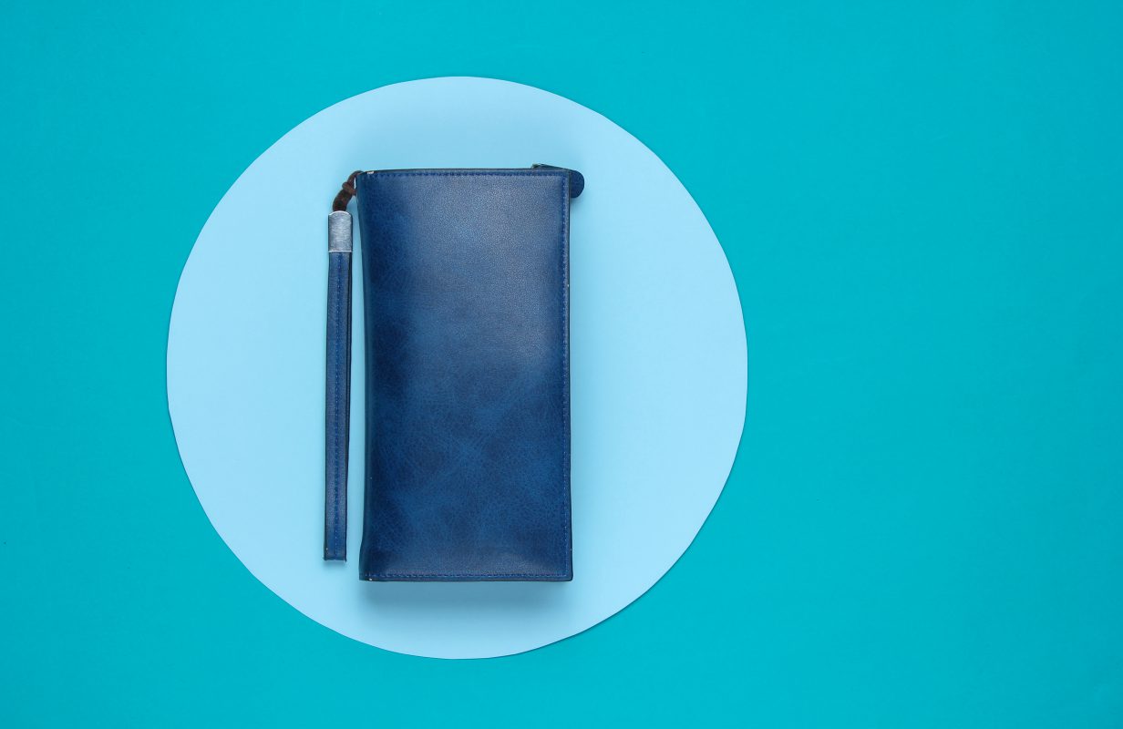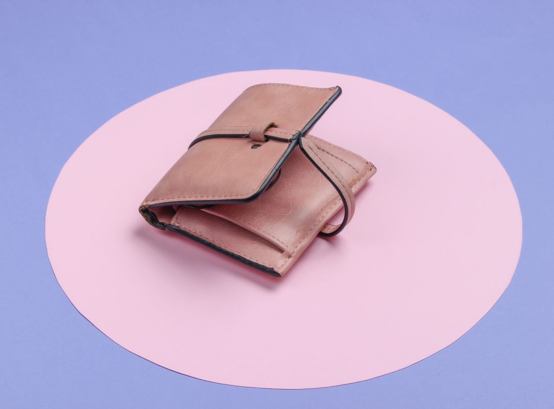 Stylish women’s leather wallet on a purple background with a pink pastel circle. Creative minimalistic fashion still life