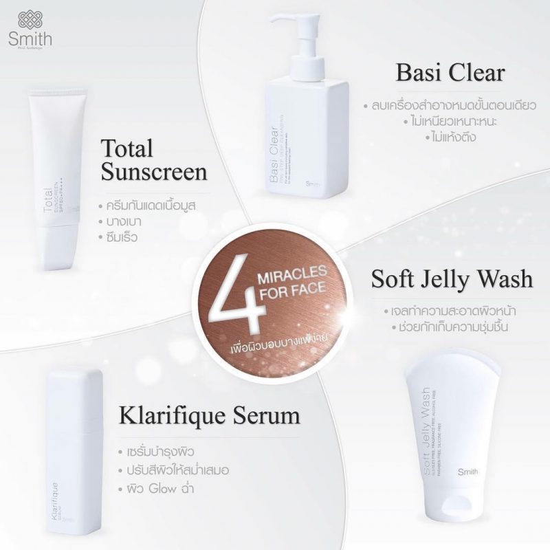 ผลิตภัณฑ์ดี ๆ ที่ถูกคิดค้นสูตรและออกแบบมาเพื่อถนอมผิวหน้าให้คุณสาว ๆ ได้มีผิวที่สะอาดปราศจากสาเหตุของการเกิดสิว แถมปกป้องและฟื้นฟูสภาพผิวได้อย่างอ่อนโยน ถ้าหากคุณกำลังมองหาผลิตภัณฑ์ที่ตอบโจทย์ทุกปัญหาเรื่องผิว อย่าลืมแบรนด์ Smith นะคะ