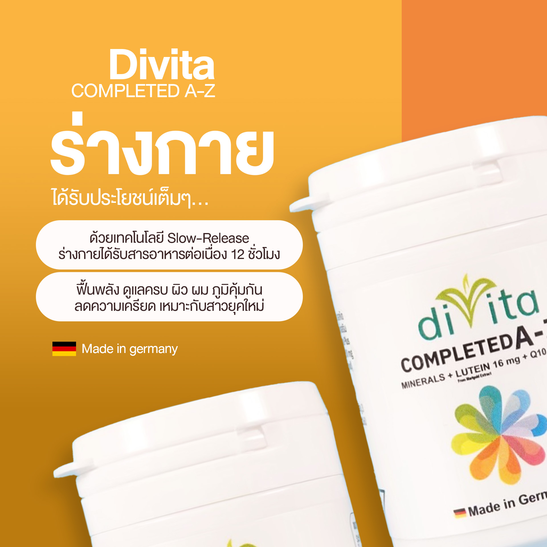 Divita Completed A-Z คือวิตามินรวมและแร่ธาตุมาตรฐานเยอรมันแท้ที่ออกแบบมาเพื่อการดูแลสุขภาพแบบองค์รวม โดยเน้นความครบจบในเม็ดเดียว ภายในประกอบด้วยวิตามินและแร่ธาตุที่ร่างกายต้องการ พร้อมเสริมพลังด้วย Lutein 16 มก. และ Coenzyme Q10 อีก 30 มก. ซึ่งจัดสูตรโดยผู้เชี่ยวชาญด้านโภชนเภสัชเพื่อให้ร่างกายได้รับสารอาหารในปริมาณที่เหมาะสมและดูดซึมไปใช้งานได้จริงอย่างมีประสิทธิภาพสูงสุดค่ะ