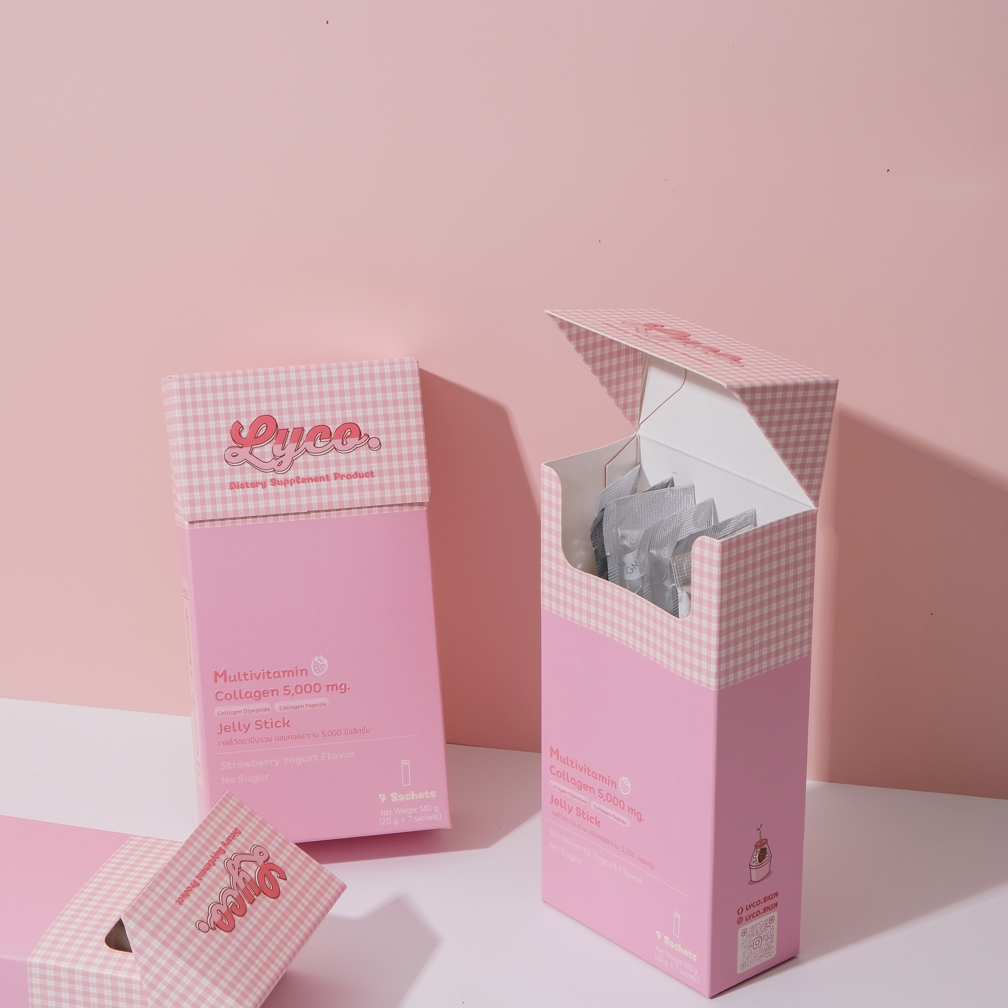 อาหารเสริมรูปแบบเจลลี่สติ๊ก รสสตรอเบอร์รี่โยเกิร์ต มีส่วนผสมของคอลลาเจน 5,000 mg. และส่วนผสมของสารสกัดจากธรรมชาติหลากหลายชนิด ช่วยบำรุงผิวพรรณ ลดการอักเสบของผิว ลดรอยดำรอยแดง ปรับสีผิวให้กระจ่างใส ช่วยต้านอนุมูลอิสระ