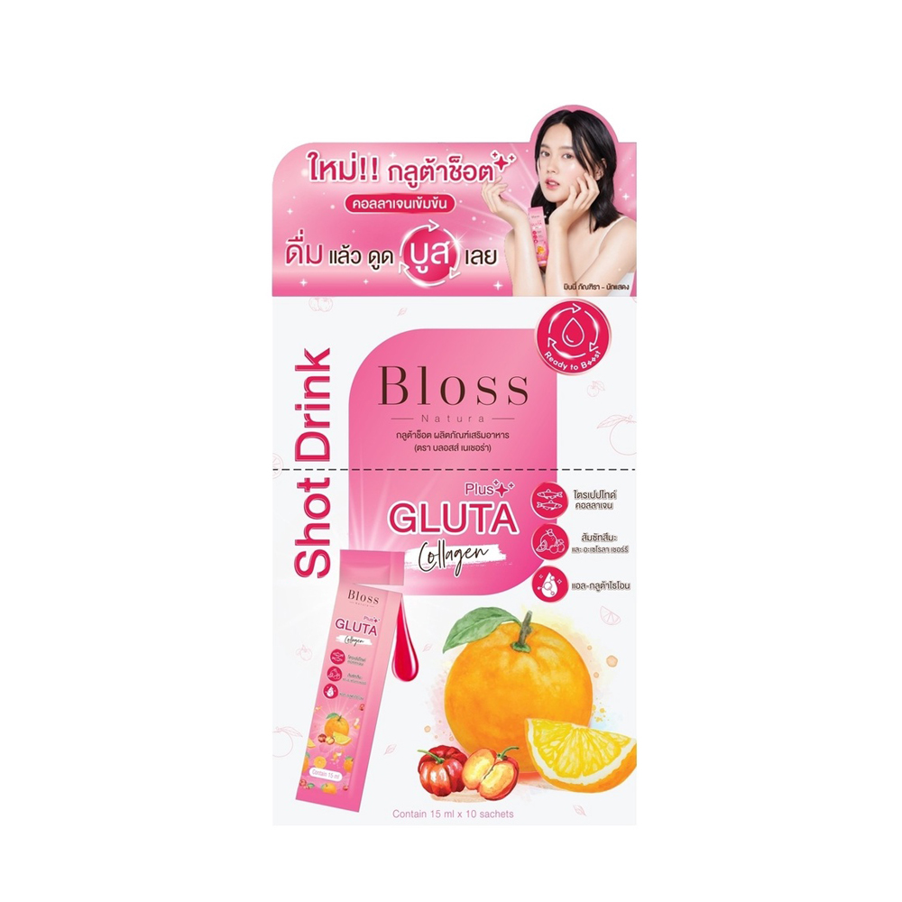 สินค้าตัวแรกของ Bloss ที่เราอยากแนะนำ คือกลูต้าช็อตผสมคอลลาเจน ไม่ต้องชง แค่ฉีกซองแล้วดื่มได้เลย สะดวกสุด ๆ เค้าเป็นกลูต้าคอลลาเจนรสชาติอมเปรี้ยวอมหวาน มีสารสกัดจากมะเขือเทศ ส้มซัทสึมะจากญี่ปุ่น เชอร์รี ทับทิม กลูต้าไธโอน คอลลาเจน วิตามิน อี และ วิตามินซี ช่วยฟื้นฟูผิว บำรุงให้ผิวใสอย่างเร่งด่วนเพียงดื่มติดต่อกันใน 15 วัน แถมเค้ามีงานวิจัยจากสเปน ว่าเป็นคอลลาเจนที่ช่วยกระตุ้นการสร้างกลูต้าได้ถึง 40% และช่วยลดการสร้างเม็ดสีเมลานินได้ 69% จากสารสกัดจากส้มซัทสึมะอีกด้วยค่ะ