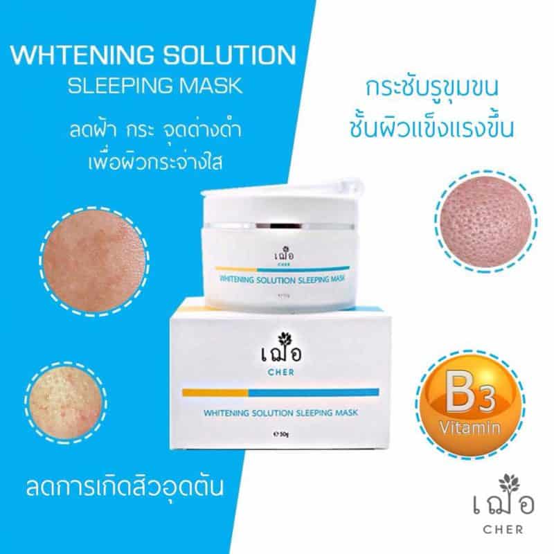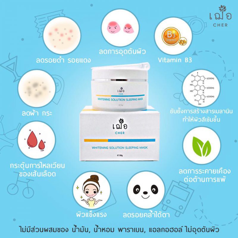 สลีปปิ้งมาร์กที่อุดมไปด้วยคุณค่าจากวิตามิน B3 ซึ่งเป็นวิตามินความบริสุทธิ์สูงที่มีประโยชน์ต่อผิว ช่วยลดริ้วรอยจาก ฝ้า กระ จุดด่างดำและยังยับยั้งการสร้างสารเมลามิน อันเป็นสาเหตุที่ทำให้สีผิวหมองคล้ำ เพิ่มความชุ่มชื้นสู่ผิวด้วยการกระตุ้นคอลลาเจนและเซราไมด์ให้ทำงานอย่างมีประสิทธิภาพ ช่วยทำให้ผิวแข็งแรง ลดสิ่งอุดตันในรูขุมขน ลดการระคายเคืองผิว เพิ่มการไหลเวียนของเส้นเลือด ฟื้นฟูสภาพผิวให้กระจ่างใส กักเก็บความชุ่มชื้นให้ผิวมีความฉ่ำน้ำ ไม่เป็นอันตรายต่อผิว ปราศจากน้ำมัน,สี,น้ำหอม,แอลกอฮอล์ และซิลิโคน ใช้ได้แม้ผิวบอบบางแพ้ง่าย