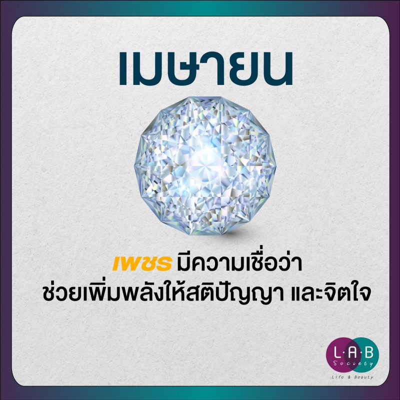 อัญมณีคือ เพชร (Diamond) ซึ่งเป็นสัญลักษณ์แห่งชัยชนะและความสำเร็จผู้ใดมีเพชร ไว้ครอบครองจะทำให้ร่ำรวย มีอำนาจ เป็นที่เกรงขาม ชีวิตรุ่งเรือง และชนะศัตรูทุกมวล ซึ่งดูแล้วเหมาะกับนักริเริ่ม นักบุกเบิกที่แข็งแกร่งอย่างชาวเมษ ที่มีความทะเยอทะยาน มีลักษณะของความเป็นผู้นำ มีอารมณ์ร้อน หุนหันพลันแล่น หัวแข่งมีความเป็นตัวของตัวเองสูง แต่ก็เป็นคนผูกมิตรกับคนอื่นได้ง่าย ชอบการเปลี่ยนแปลง ไม่ชอบอยู่นิ่ง ชอบค้นคว้าหาคำตอบทุกสิ่งด้วยตัวเอง อัญมณีที่มีสีขาวใสอย่างพลอยเพทายขาว (White Zircon) ก็จัดเป็นอัญมณีประจำราศีนี้เช่นกัน เนื่องจากสีขาวใสเทียบได้กับทารกเกิดใหม่ที่ยังบริสุทธิ์อยู่นั่นเอง