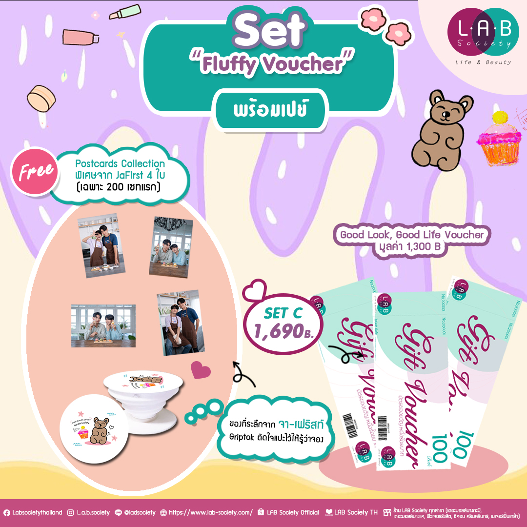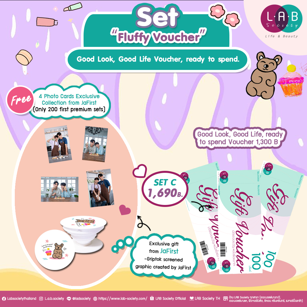 ✅Set C “Fluffy Voucher” เซตพร้อมเปย์เพื่อเธอ 💲Voucher ที่สามารถช้อปสินค้าทุกอย่างจากร้าน LAB Society ด้วย 💥Good Look, Good Life Voucher มูลค่า 1,300 บาท💥 มาพร้อมกับของที่ระลึกจาก จา-เฟิร์ส Griptok ติดมือถือแปะไว้เลยให้รู้ว่าจอง❤