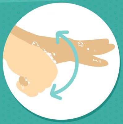 STEP 7: ถูข้อมือ กำรอบข้อมือด้วยมืออีกข้าง แล้วถูวนซ้ำ ทำสลับกันทั้งสองข้างให้สะอาด
