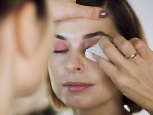 เทใส่สำลีแล้วเช็ดบนใบหน้าที่มีเมคอัพ