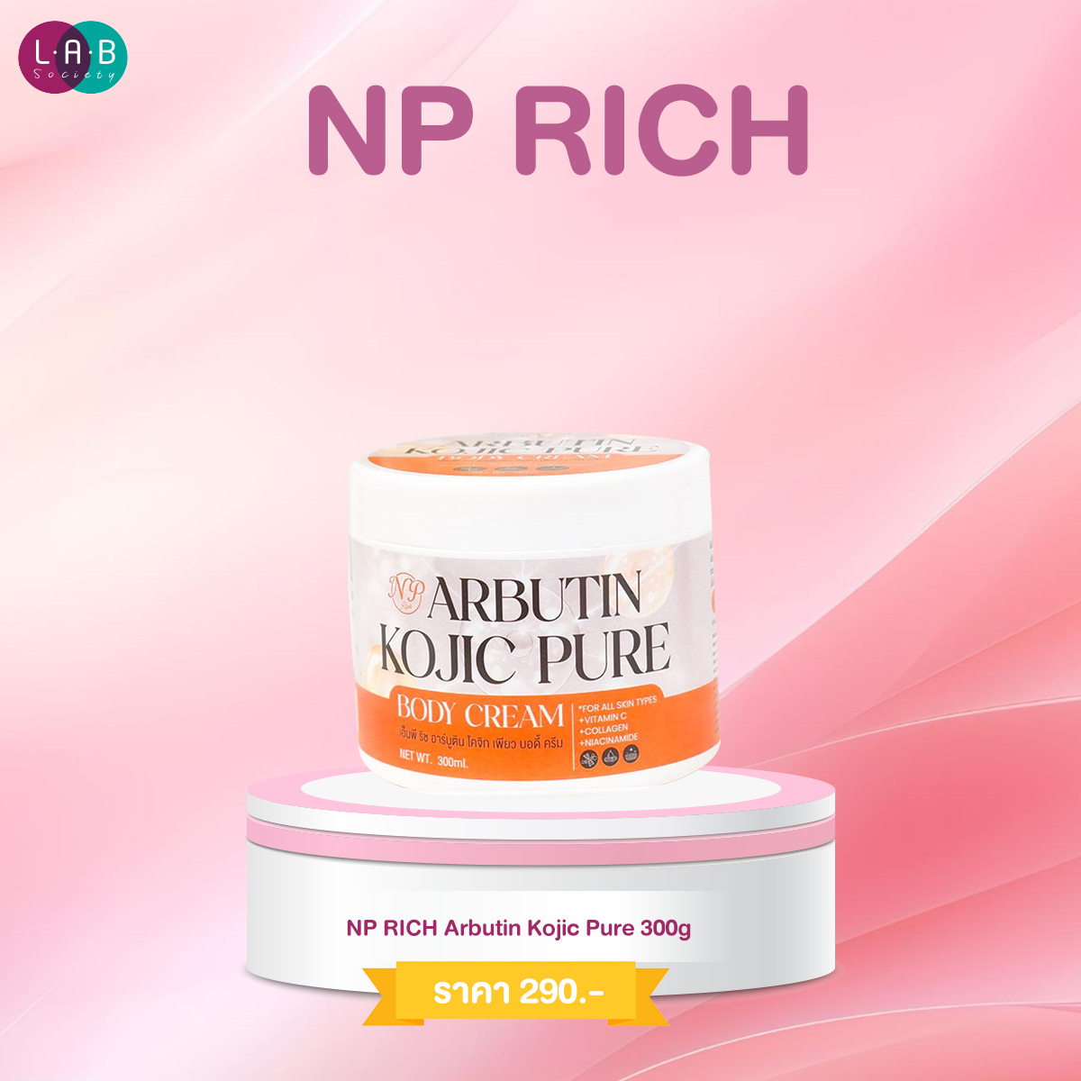 NP RICH Arbutin Kojic Pure ครีมบำรุงผิวกายสูตรเข้มข้น ช่วยบำรุงให้ผิวกระจ่างใส ชุ่มชื้น ลดปัญหารอยแตกลาย มีส่วนผสมของ Arbutin หรือ สารสกัดจากผลไม้ในตระกลูเบอร์รี่ กรดโคจิก คอลลาเจน และวิตามินซี ที่ช่วยลดความหมองคล้ำ ยับยั้งการสร้างเม็ดสีเมลานิน และช่วยให้ผิวชุ่มชื้นกระจ่างใส เหมาะกับผู้ที่มีปัญหาผิวหมองคล้ำ มีรอยแตกลาย มีจุดด่างดำ