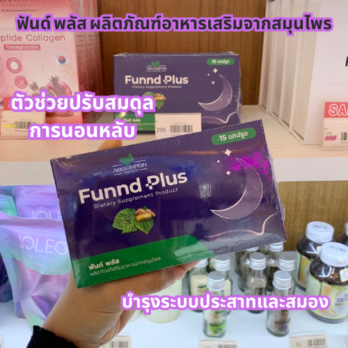 ตัวสุดท้าย ตัวช่วยเพิ่มประสิทธิภาพในการนอน ภายใต้แบรนด์อรุณพร Funnd Plus ผลิตภัณฑ์เสริมอาหารจากสมุนไพร ได้แก่ ช้าพลู ขิง พริกไท โสมเกาหลี บัวบก ชะเอมเทศ เก๋ากี้ และโกฐเชียง เหมาะกับผู้ที่มีปัญหาการนอนหลับและปรับสมดุลการนอนหลับในระยะยาว