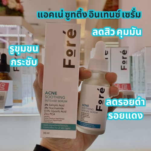 ถัดมาเหมาะมากๆ สำหรับผิวเป็นสิว FORE Acne Soothing Intense Serum 30ml เซรั่มตัวช่วยลดการเกิดสิว ลดความมันบนใบหน้า และช่วยลดรอยดำ รอยแดงจากสิว พร้อมปลอบประโลมผิว