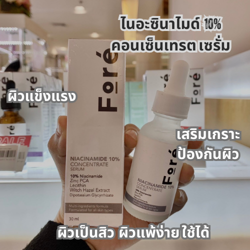 เซรั่มตัวแรก FORE Niacinamide 10% Concentrate Serum 30 ml เซรั่มบํารุงผิวหน้า Niacinamide เข้มข้น 10% ช่วยปรับสีผิวให้ดูสม่ำเสมอ ปลอบประโลมผิว และยังช่วยให้ผิวดูกระจ่างใสขึ้น ที่สำคัญตัวนี้ยังช่วยบํารุงผิวให้แข็งแรงและเพิ่มความชุ่มชื้นให้ผิวหน้าด้วย