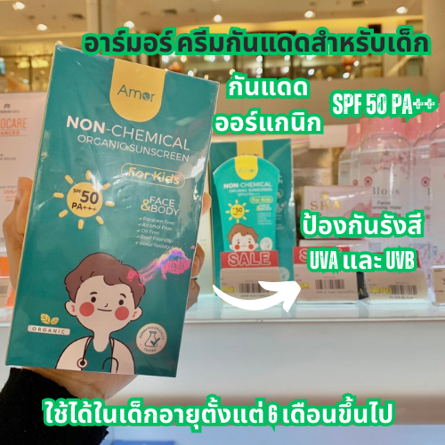 ต่อด้วยครีมกันแดดสำหรับเด็ก Amor Non-Chemical Organic Sunscreen SPF50 PA++ กันแดดออร์แกนิก ส่วนผสมจากธรรมชาติ ป้องกันรังสี UVA UVB ใช้ได้ในเด็กอายุตั้งแต่ 6 เดือนขึ้นไป และช่วยบำรุงผิวให้ชุ่มชื้น ดูกระจ่างใส