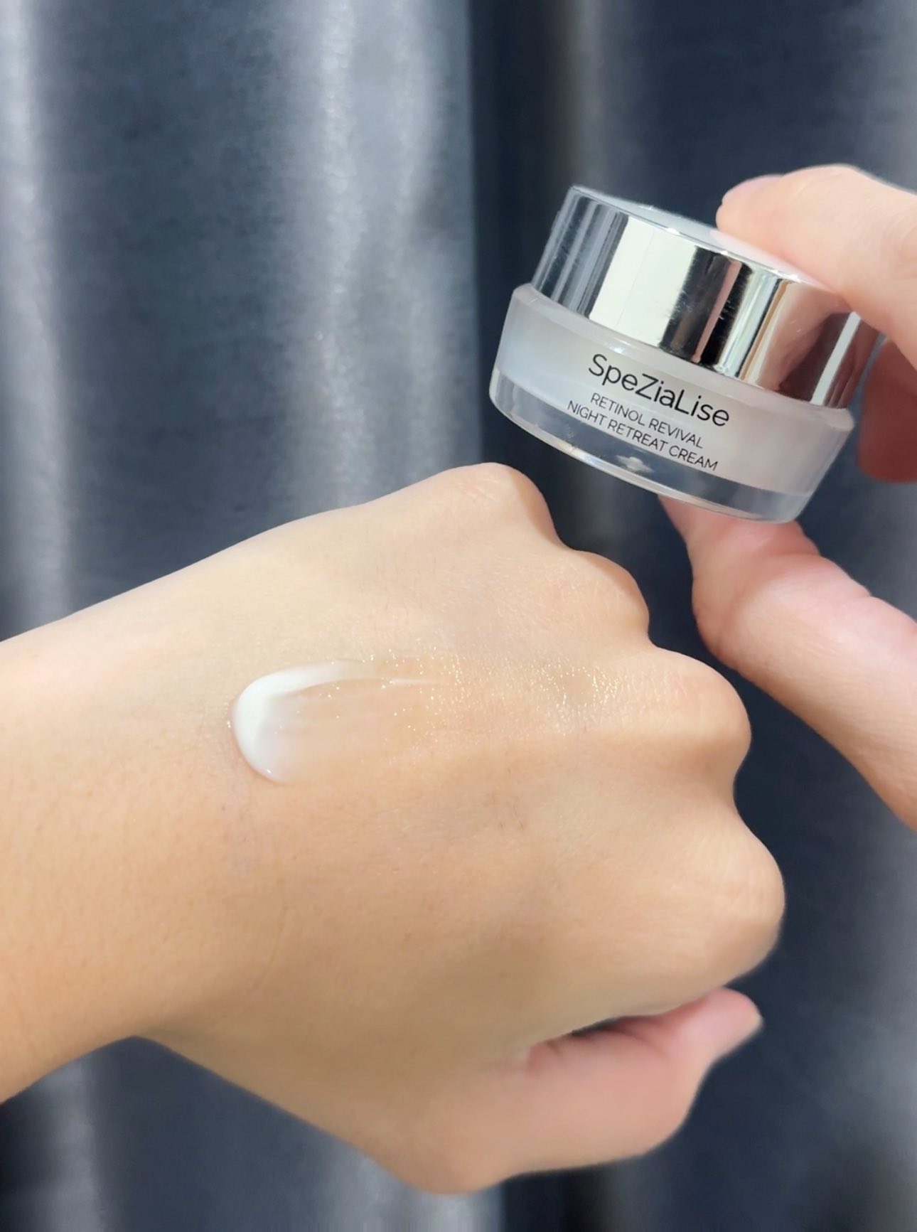 ไอเทมเด่นของแบรนด์ Spezialise Retinol Revival Night Retreat Cream ครีมบำรุงผิวหน้าเวชสำอางที่ออกแบบมาเพื่อคืนความอ่อนเยาว์ให้กับผิวทุกวันก่อนนอน ด้วยส่วนผสมจาก Hyaluronic Acid ช่วยกักเก็บความชุ่มชื้น ทำให้ผิวอิ่มน้ำ เรียบเนียน และยืดหยุ่นขึ้น ผสานกับ Rovisome® Retinol เรตินอลแบบพิเศษที่ห่อหุ้มด้วยเทคโนโลยี Rovisome ช่วยลดการระคายเคือง พร้อมผลัดเซลล์ผิวเก่า เผยผิวใหม่ที่กระจ่างใสและเรียบเนียน นอกจากนี้ยังมี Nano White ช่วยลดจุดด่างดำและความหมองคล้ำ Vitamin E ทำหน้าที่ต้านอนุมูลอิสระ และ Pistacia Lentiscus ที่ช่วยกระชับผิว ฟื้นฟูเกราะป้องกันผิว รวมครบในขั้นตอนเดียว ใครที่มีผิวแห้ง ริ้วรอยแรกเริ่ม หรือจุดด่างดำ ครีมตัวนี้เป็นตัวช่วยที่ไม่ควรพลาด
