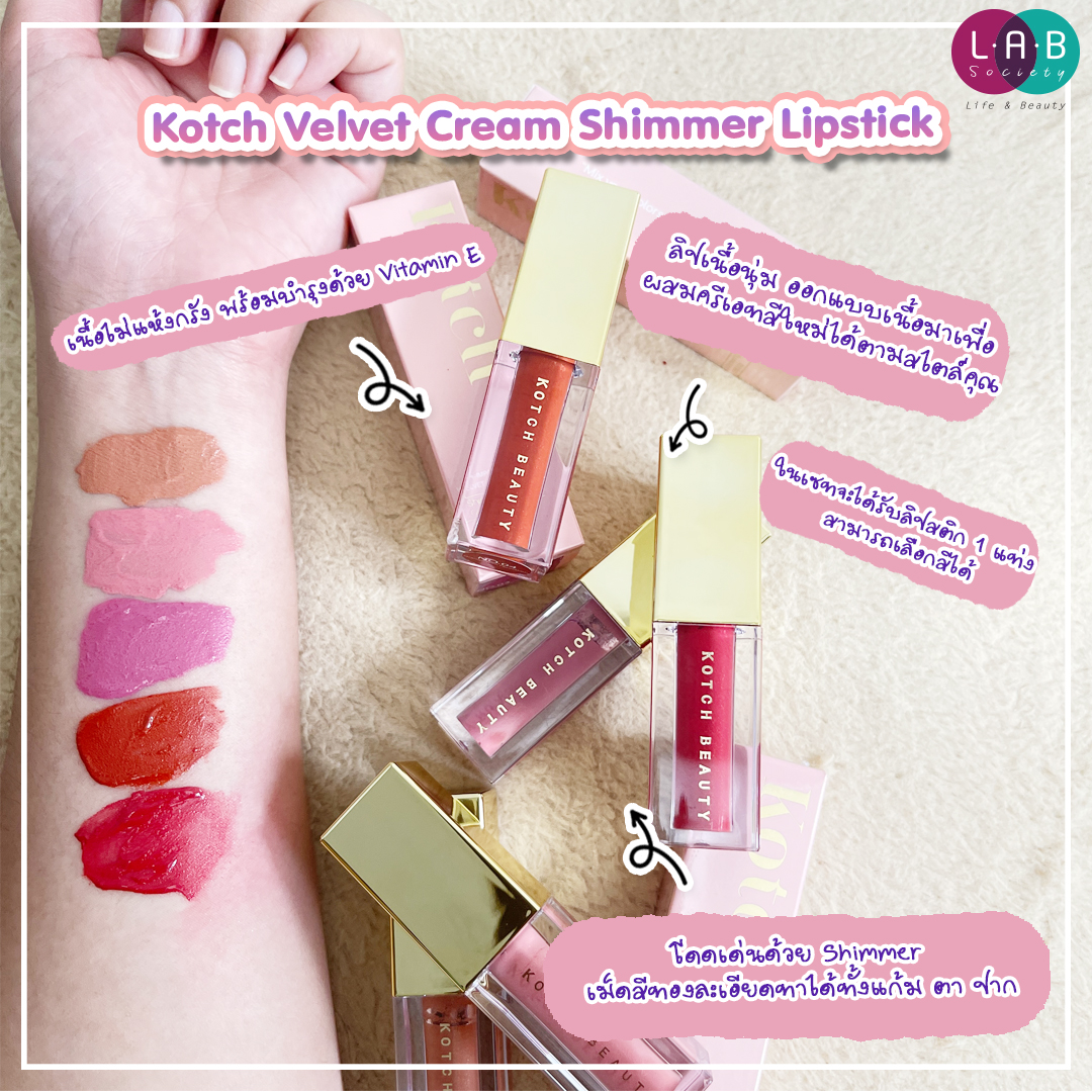 😄ความสุขชิ้นต่อมา เป็นความสุขชิ้นเล็ก ๆ ที่ช่วยแต่งเติมสีสันให้กับริมฝีปากคู่สวยให้สดใสได้ในทุกวันกับ 💄Kotch Velvet Cream Shimmer Lipstick 👄 ลิปเนื้อเวลเวทนุ่มละมุนปาก ทาแล้วรู้สึกปากนุ่มชุ่มฉ่ำ ให้ฟิลล์ปากแบบนุ่มนิ่ม คือเป็นเนื้อลิปที่มีความพอดีมาก ไม่แห้งเกินไป และไม่ฉ่ำเกินไป ลงตัวเป๊ะ👍 ทาแล้วปากรู้สึกชุ่มชื้นขึ้น เพราะเขามี Vitamin E ที่ช่วยบำรุงปากไม่ให้แห้ง แตก คล้ำ มาพร้อมกับ Shimmer สีทองเนื้อละเอียดยิ่งทำให้ปากดูอวบอิ่ม แล้วถ้าพูดถึงสีของลิป ก็ต้องบอกเลยว่าเป็นโทนสีที่แต่งได้ทุกลุค😮 ทำให้แต่งหน้าแต่งตัวสนุกขึ้นได้ในทุกวัน แท่งเดียวก็ว่าคุ้มแล้วนะ เพราะเขาใช้ได้ทั้งปาก ตา แก้ม แต่พอมี 2 สีแล้วเอามาเบลนด์เข้าด้วยกันก็ได้ลิปสีใหม่ไปอี๊กกกก…ปังมาก ๆ สุดต๊าซซซ🤩ใน 1 เซ็ตเลือกลิปได้ 1 แท่งชอบสีไหนก็กดเลือกไปเลยซิคะ😘